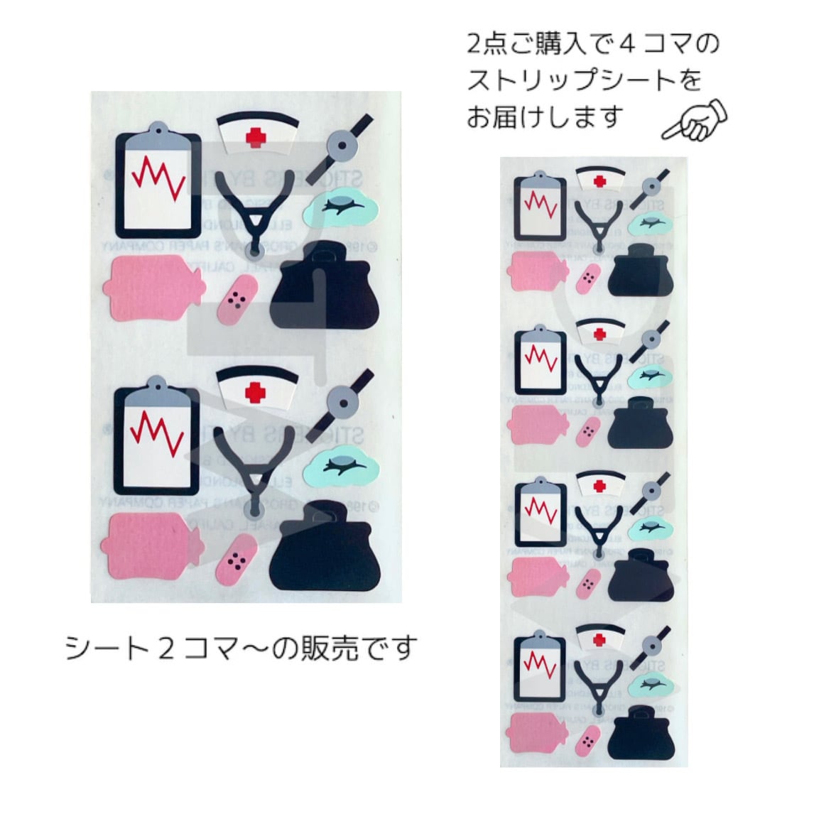 (例:2点購入で4コマのstripシートをお届けします)